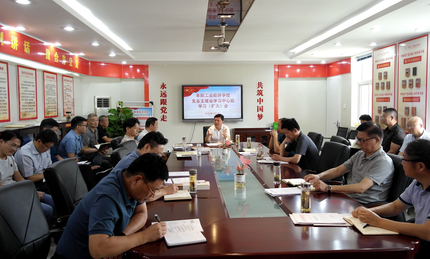 9月9日,我校召开党总支理论学习中心组学习(扩大)会,校班子成员、各科室负责人参加会议。会议由校党委书记、校长周波主持。