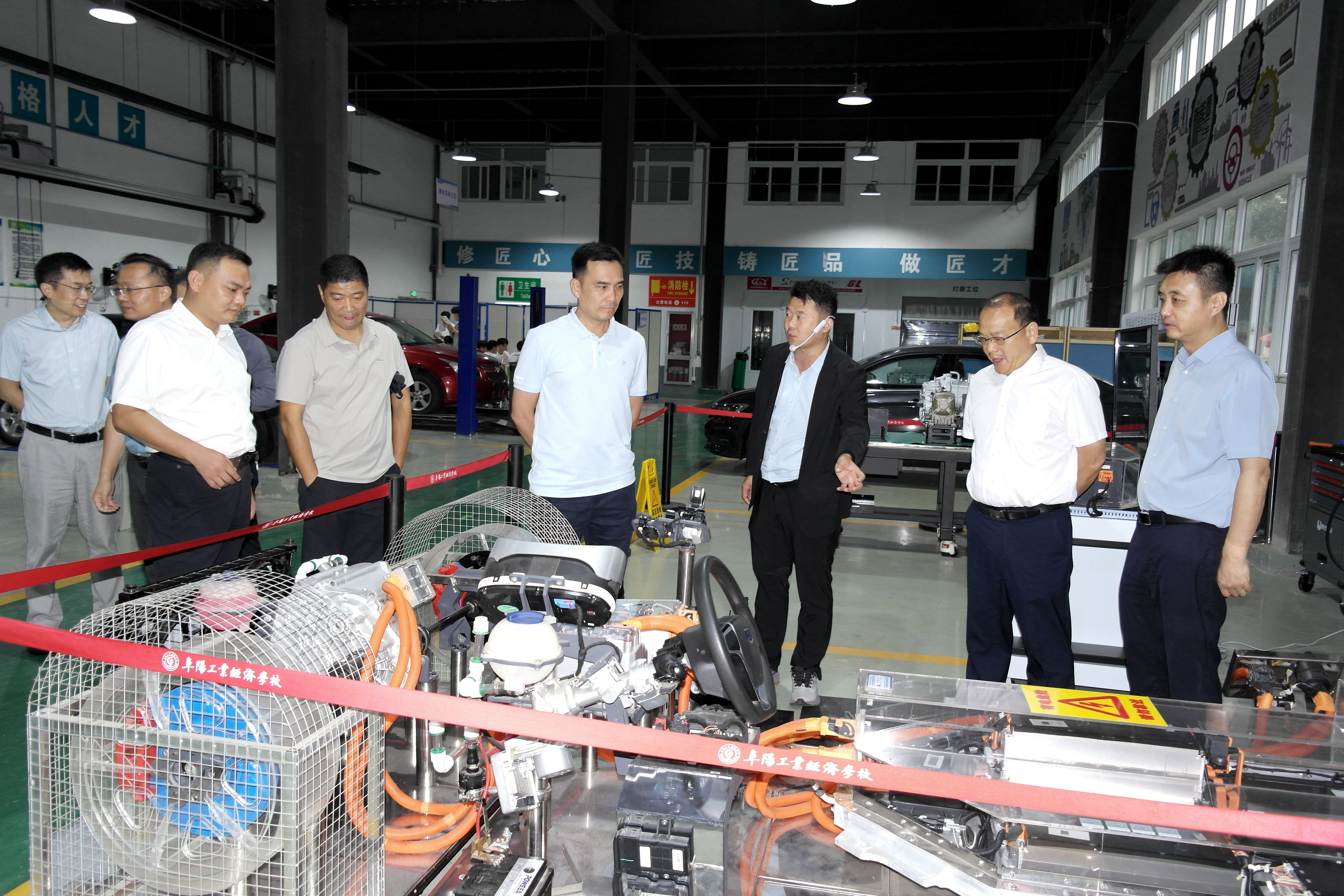 活动中,阜合园区领导及企业代表在我校领导陪同下,实地参观了数控技术、汽车运用与维修等重点专业实训室,直观了解实训教学条件与学生技能培养情况,为后续实训基地共建、技术合作等事项奠定实践基础。