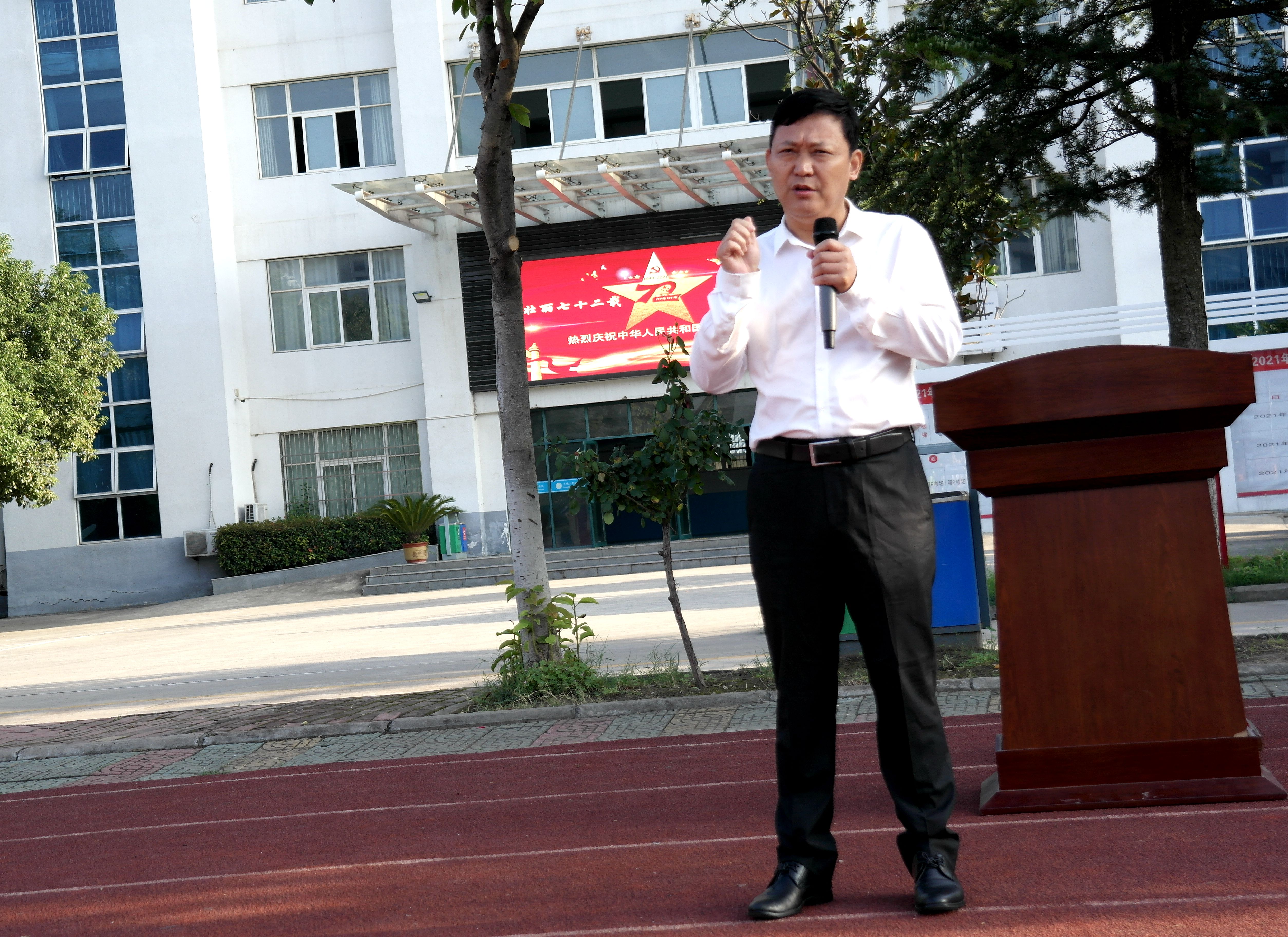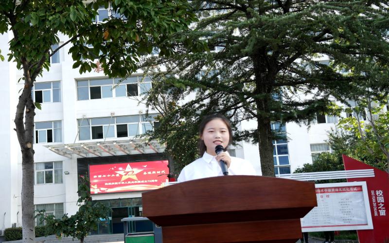 随后全体师生怀着对祖国的热爱,饱含深情同唱国歌,注视国旗冉冉升起。校微宣讲团成员丁清霜作了国旗下的“礼赞新中国 奋进新时代”主体宣讲,并联系学习党史和学习经历,激发同学们要以实现中华民族伟大复兴为已任,增强做中国人的志气、骨气、底气,不辜负党和人民的殷切希望。