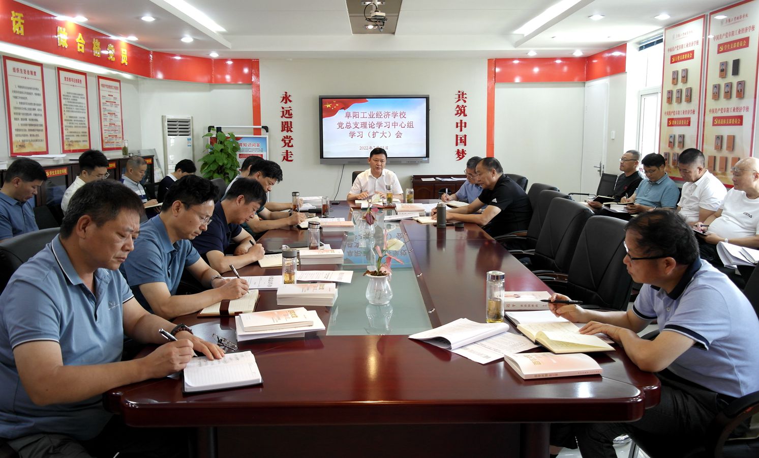 7月25日,我校召开党总支理论学习中心组学习(扩大)会,校班子成员、各科室负责人参加会议。会议由校党委书记、校长周波主持。