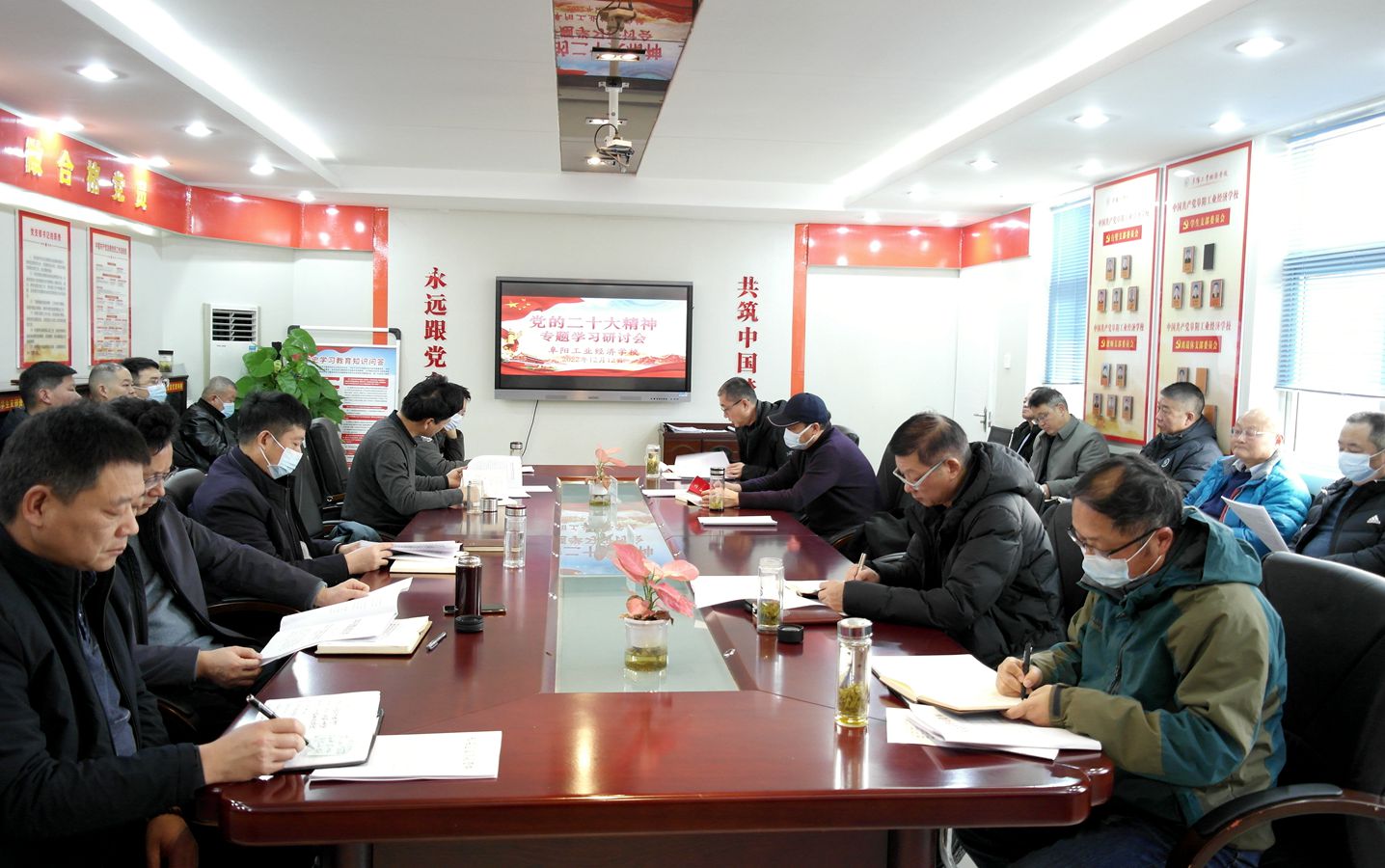 12月12日,阜阳工业经济学校召开2022年第十五次党总支理论学习中心组学习(扩大)会暨党的二十大精神专题学习研讨会。校班子成员、各科室负责人参加会议。