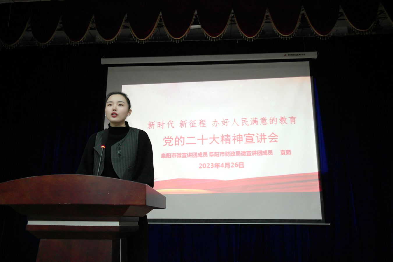 为深入学习宣传贯彻党的二十大精神,切实引导全校师生坚持正确政治方向,增强政治责任感和使命感,把思想和行动统一到党的二十大精神上来,把党的二十大精神落实落细、走深走实,4月26日下午,市微宣讲团成员、市财政局微宣讲团成员、我校教师袁茹作学习“党的二十大精神”专题宣讲,800余名师生到会聆听。