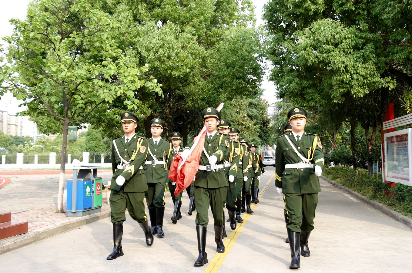 升旗仪式上,全体师生面向国旗排列成整齐的队伍,国旗护卫队的同学们精神抖擞,迈着铿锵有力的步伐护卫着国旗入场,全体师生注目国旗,奏唱国歌。鲜艳的五星红旗冉冉升起,在熠熠晨光中迎风飘扬。