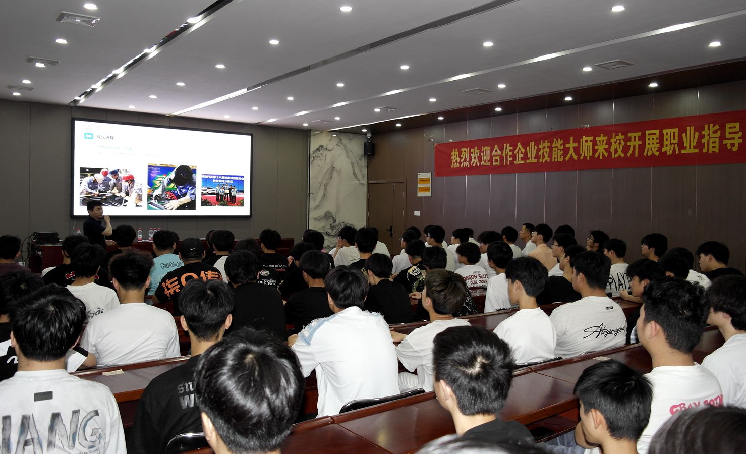 在实训楼报告厅,王俊峰老师围绕汽车行业前沿技术、典型故障案例分析、职业技能大赛经验分享、技术技能等模块展开。并针对汽修行业人才需求,分享职业规划建议,强调工匠精神与终身学习理念,激发学生职业认同感与学习热情。王老师用自己的亲身经历来激励学生,告诉他们技能铸就人生、匠心成就梦想的道理。他鼓励学生们要敢于追梦、勇于实践,用自己的双手和智慧去创造美好的未来。