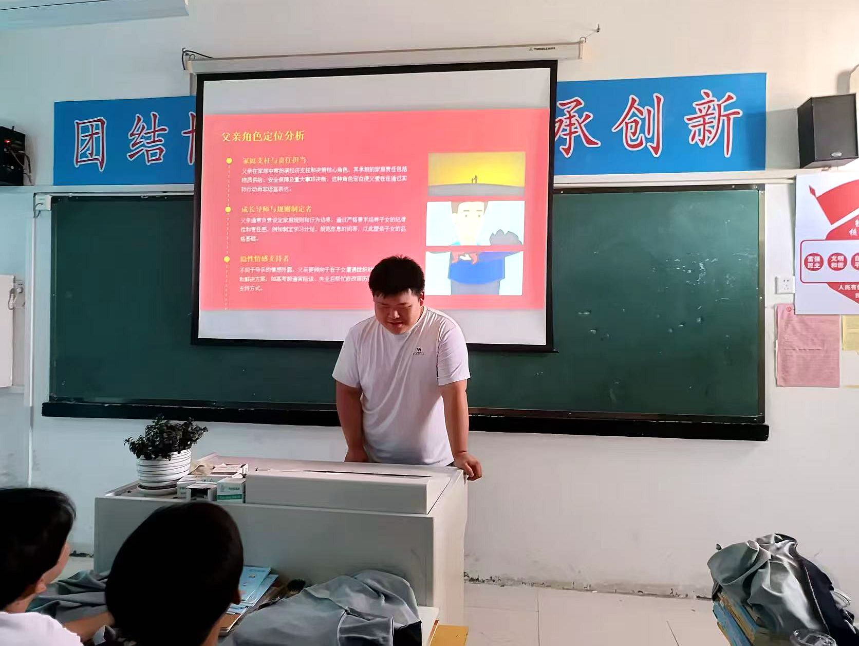 学生们踊跃走上讲台,分享与父亲相处的难忘经历:有的讲述父亲深夜冒雨背自己就医的艰辛;有的回忆父亲耐心教导骑车时的鼓励;还有的分享父亲冒雨送伞、病床前彻夜守护的温情时刻……一个个真实故事引发全场共鸣,让学生深刻体会父爱的无声与厚重。