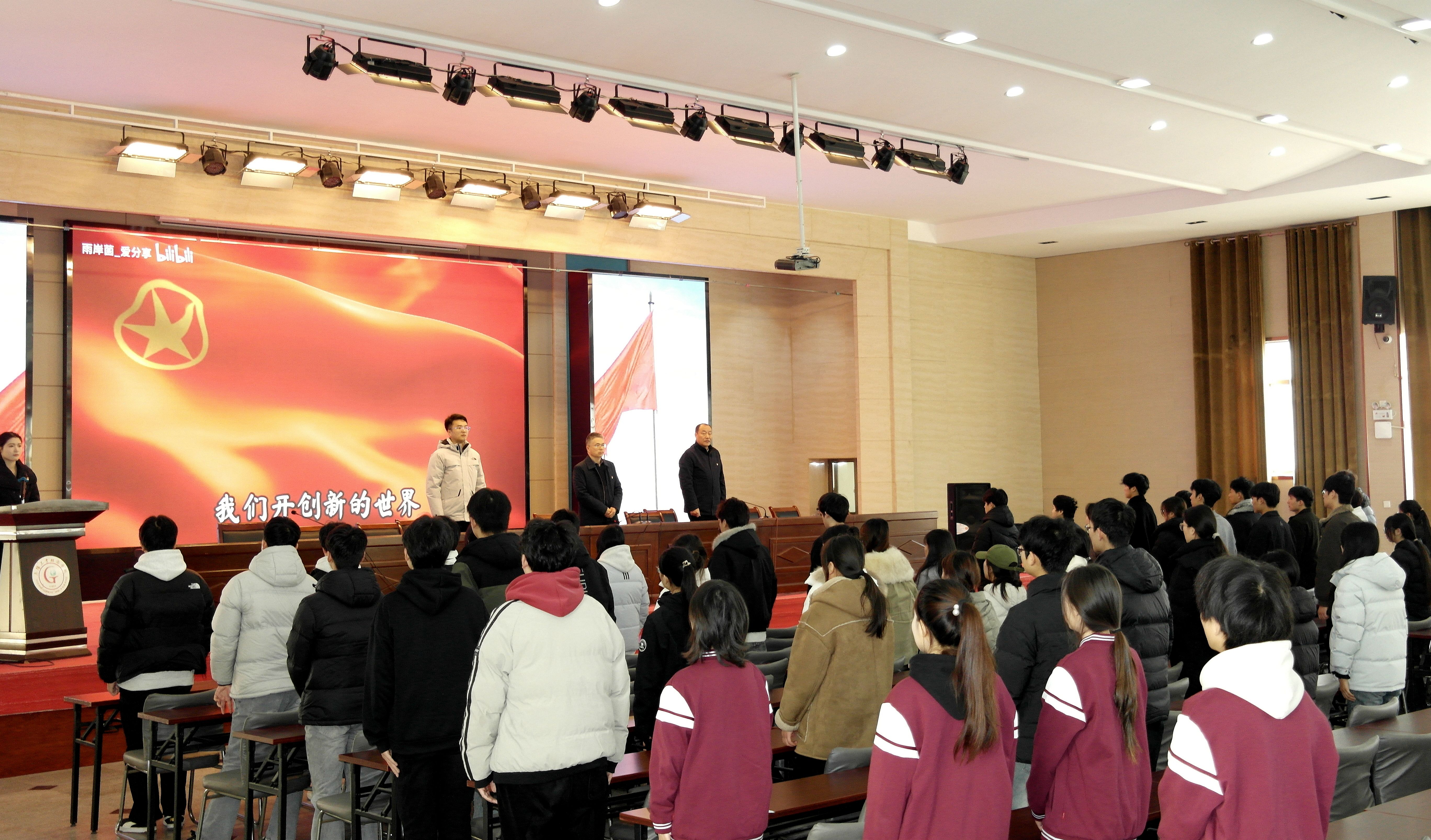 国歌旋律响起,全场肃立高歌。激昂乐声与蓬勃青春之声交织回荡,新团员眼中闪烁着赤诚的爱国光芒,让即将启幕的入团宣誓,更添深切的使命与荣光。