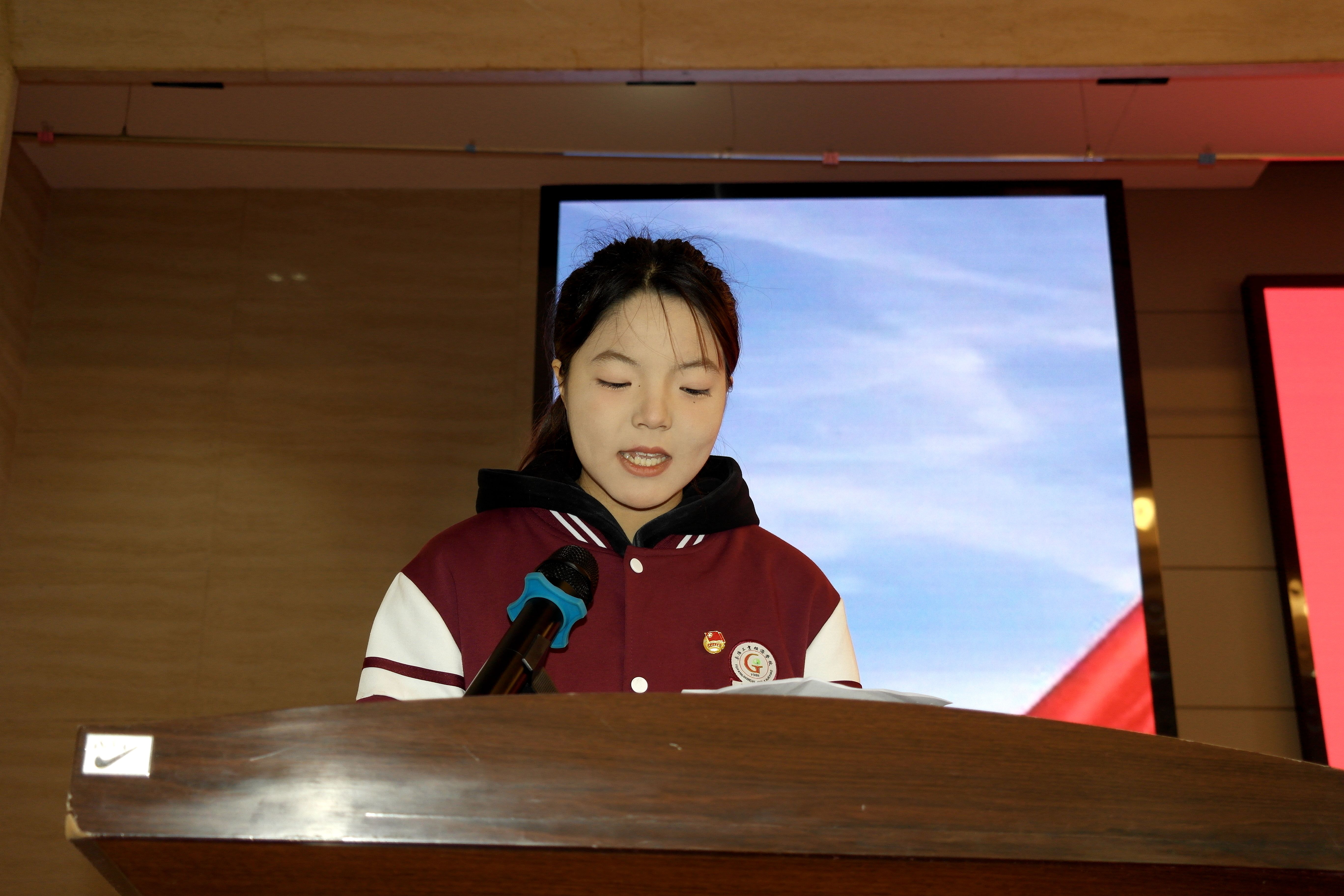 优秀团员代表陈雨馨上台发言。他们回望入团以来在团组织培养下淬炼成长、勇担使命的点点滴滴,细致讲述履职尽责、争先创优的奋进历程,用心为新团员传经送宝、赋能鼓劲。