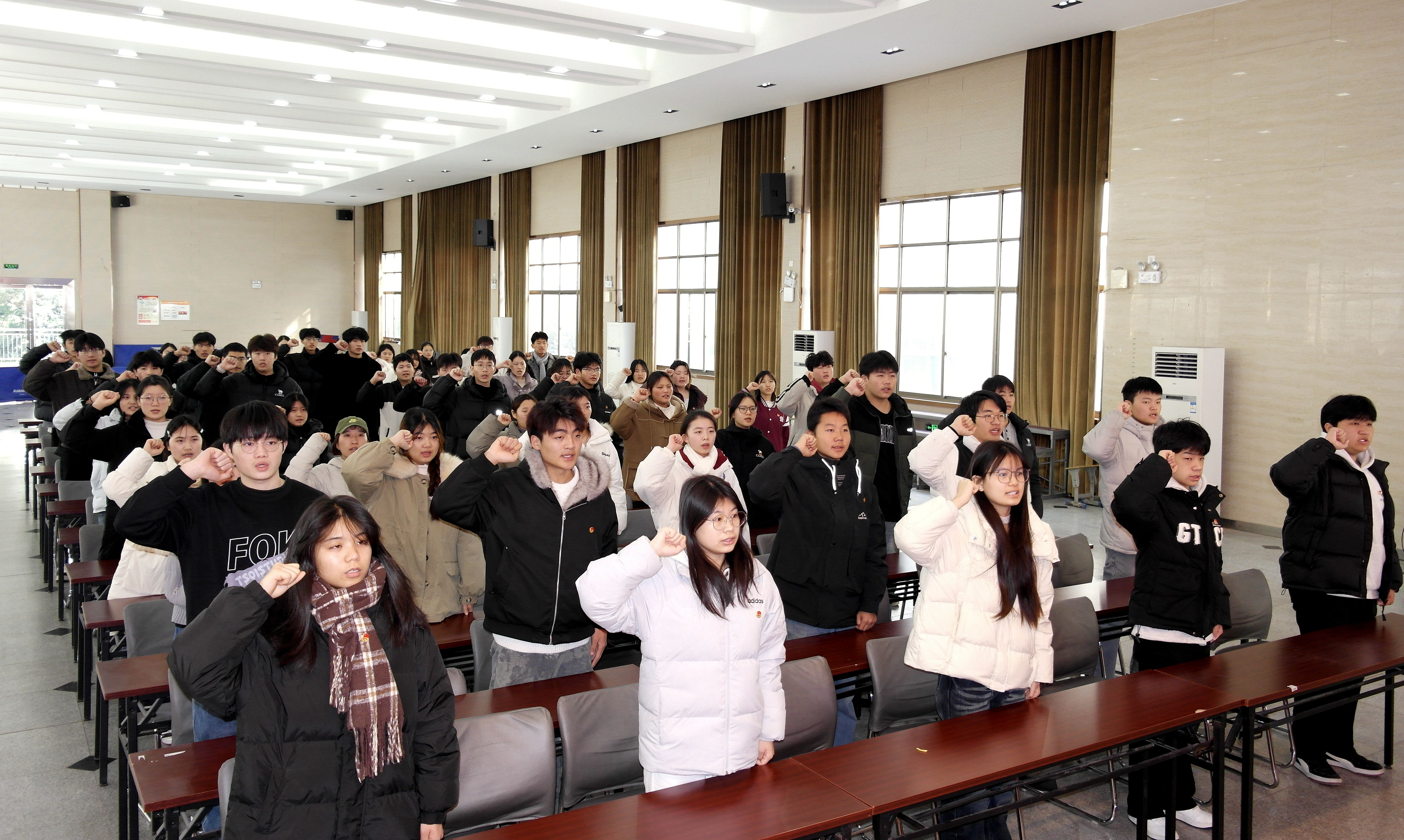 随后进入宣誓环节,新团员们肃立凝神、右拳高举过肩,以洪亮之声庄严宣誓:“我志愿加入中国共产主义青年团,坚决拥护中国共产党的领导,遵守团的章程,执行团的决议,履行团员义务,严守团的纪律,勤奋学习,积极工作,吃苦在前,享受在后,为共产主义事业而奋斗。”誓言铮铮、字字千钧,饱含新团员对团组织的赤诚之心,更彰显了他们矢志为共产主义事业奋斗终生的坚定信念。