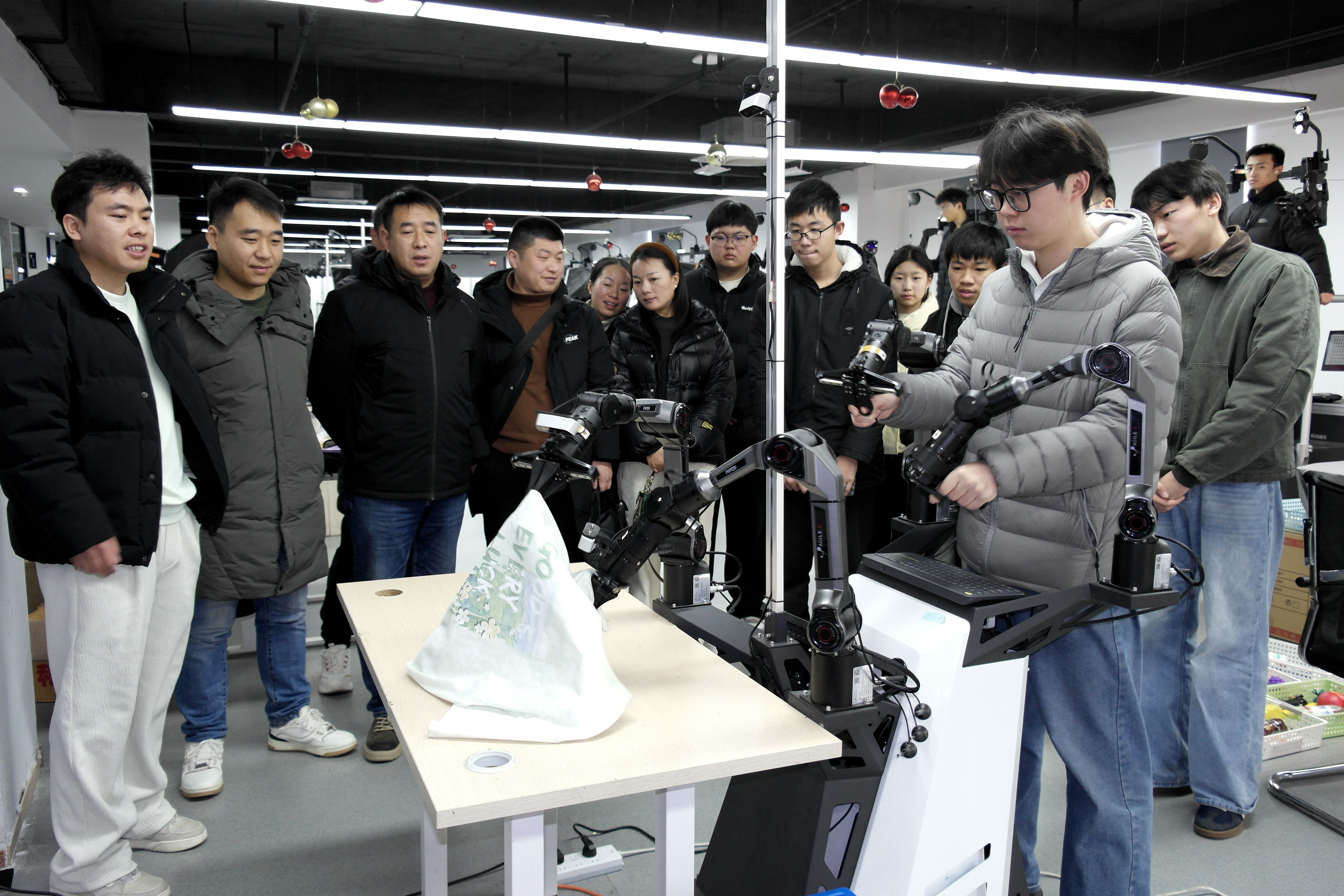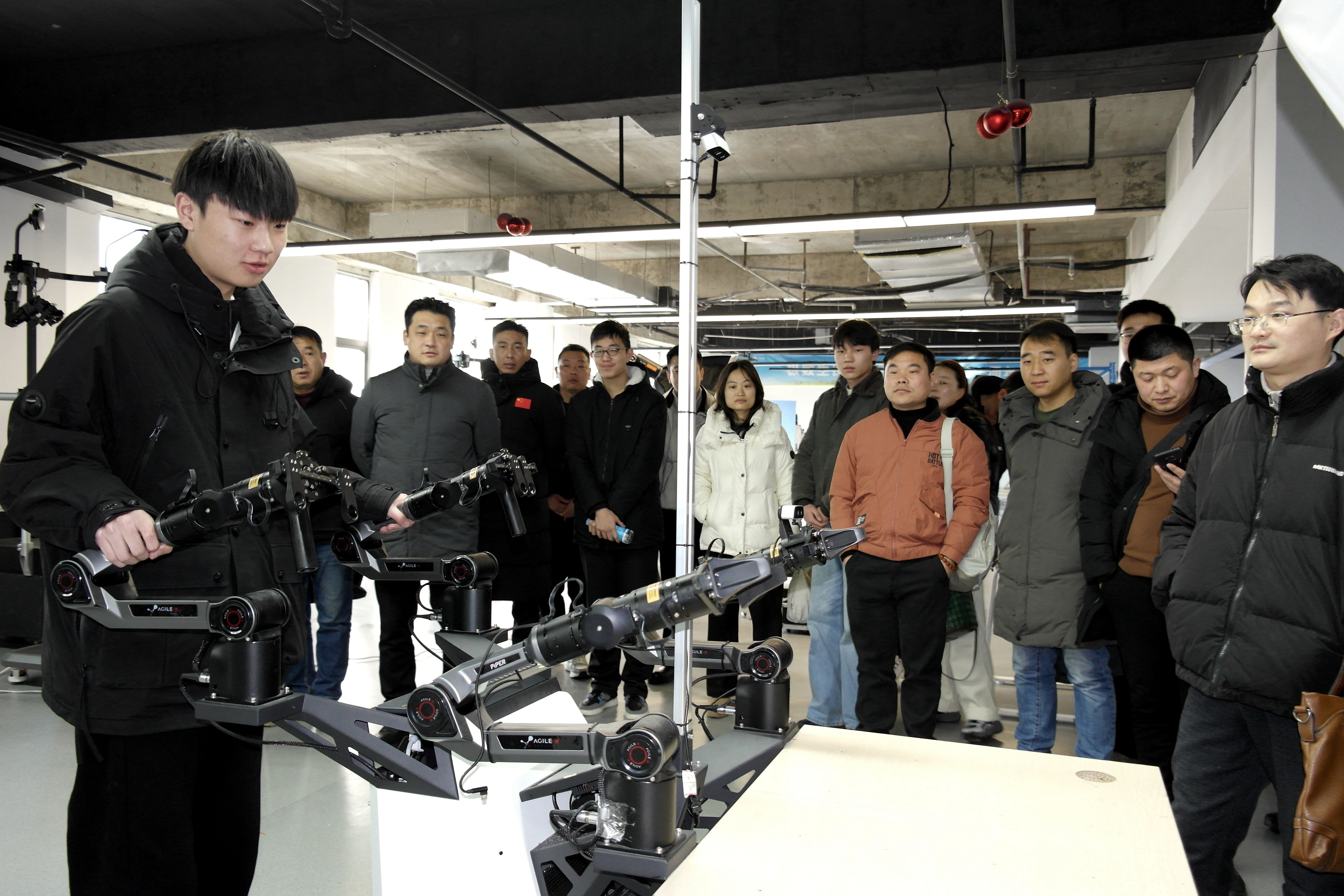 在安徽飞数信息科技有限公司,学习团实地查看学生实训环境,参观并体验腕部抓取机器人的研发场景和操作过程,全面了解了该类型机器人智能识物功能的实操步骤和技术应用,深化关于具身机器人训练的现实意义和实训价值的认识。学习团围绕着“将产业需求融入人才培养过程,塑造智能时代的‘大国工匠’”进行深入探讨,希望以此次参观为契机,学校和企业可以建立长期、稳定、深入的合作关系,共同探索符合人工智能时代需求的人才培养新模式。