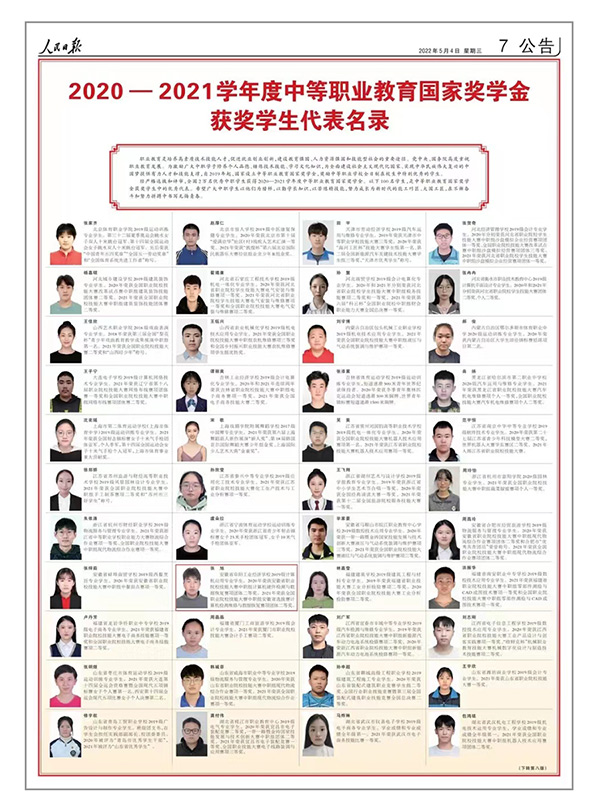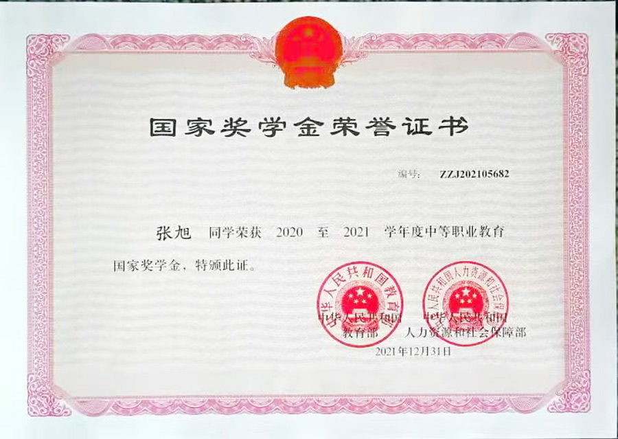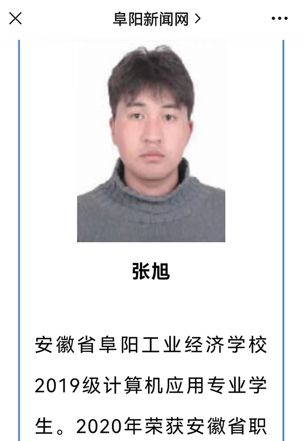 张旭同学2022年5月荣获2020—2021学年度中职国家奖学金优秀学生代表线上(阜阳新闻网)宣传。