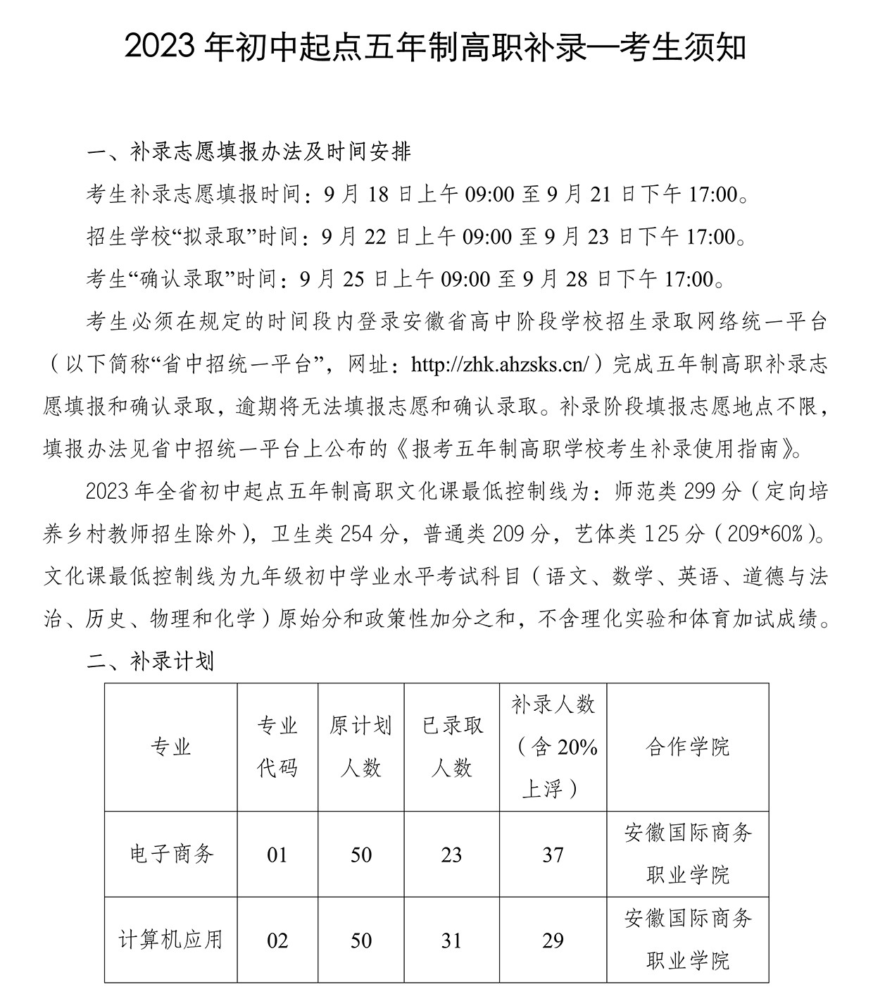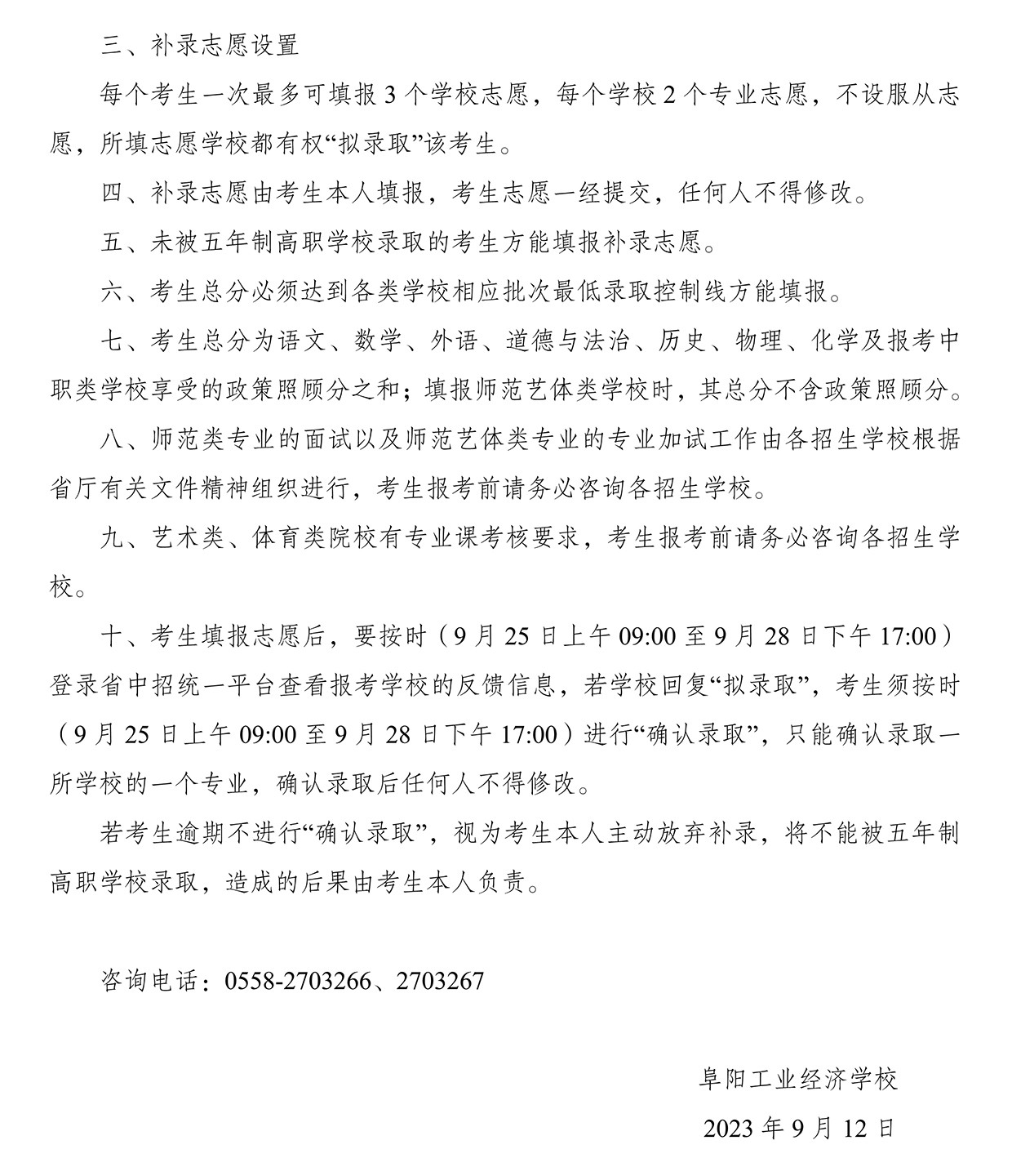 2023年初中起点五年制高职二轮补录—考生须知