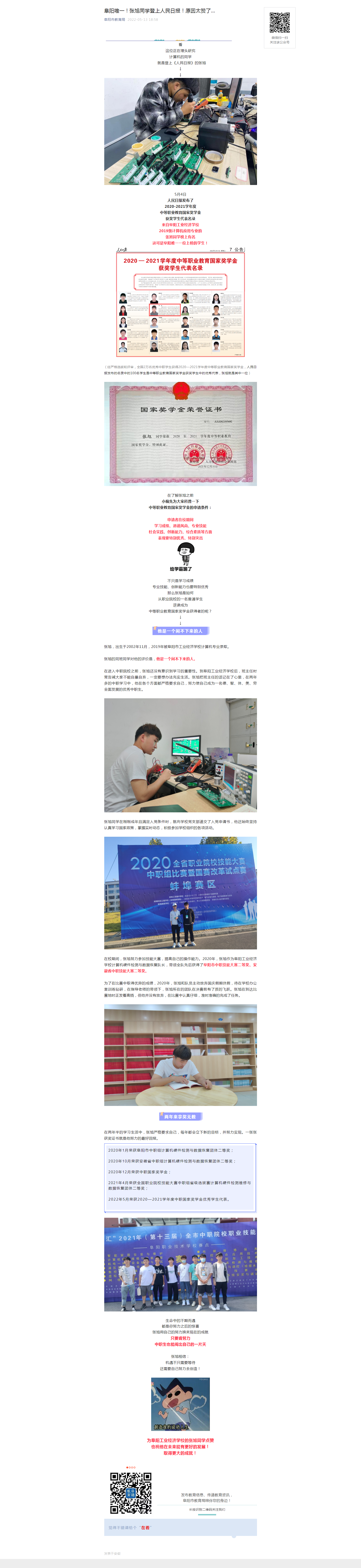 阜阳市教育局官方公众号转发报道阜阳工业经济学校张旭同学荣获国家奖学金优秀代表事迹