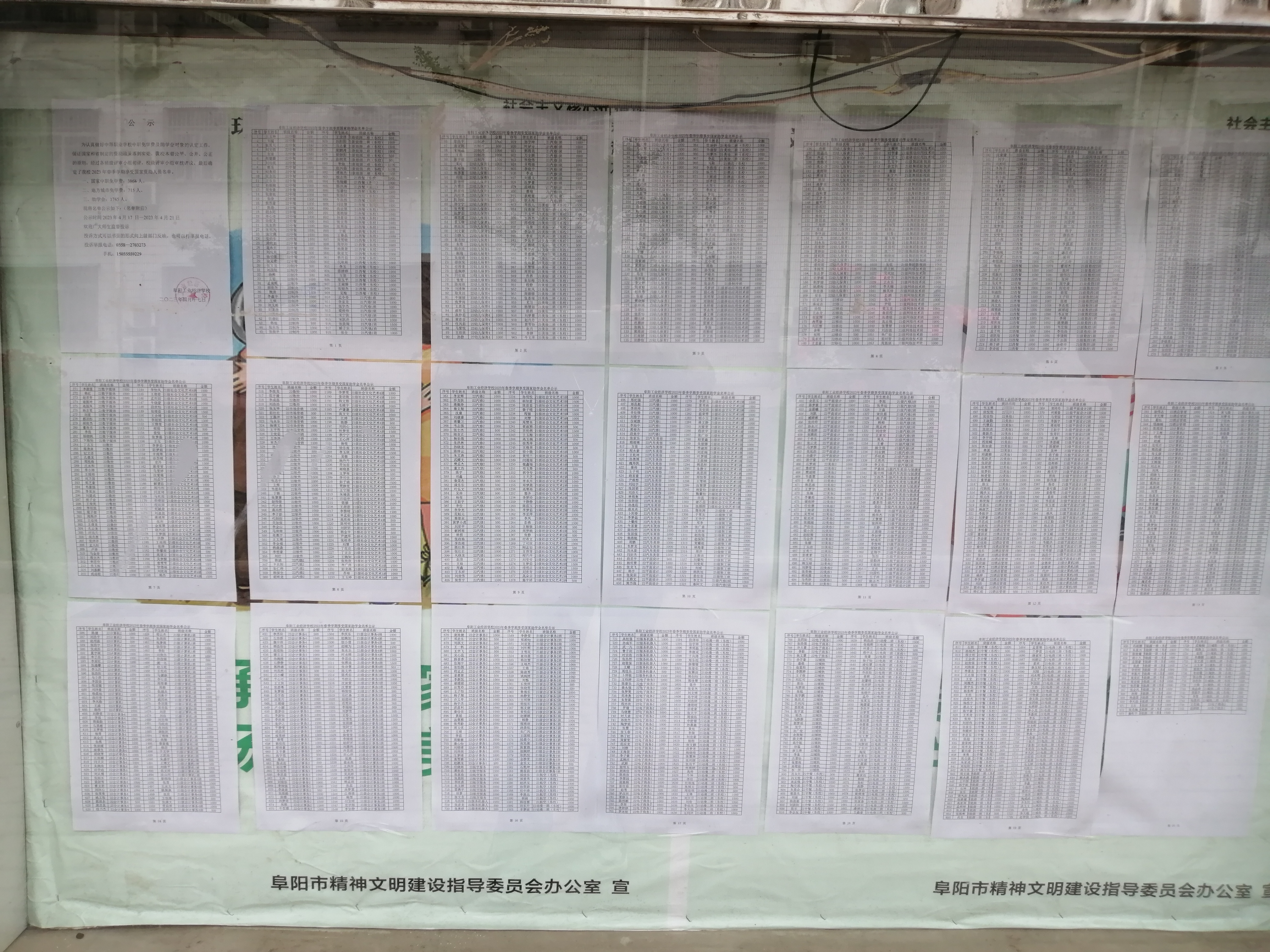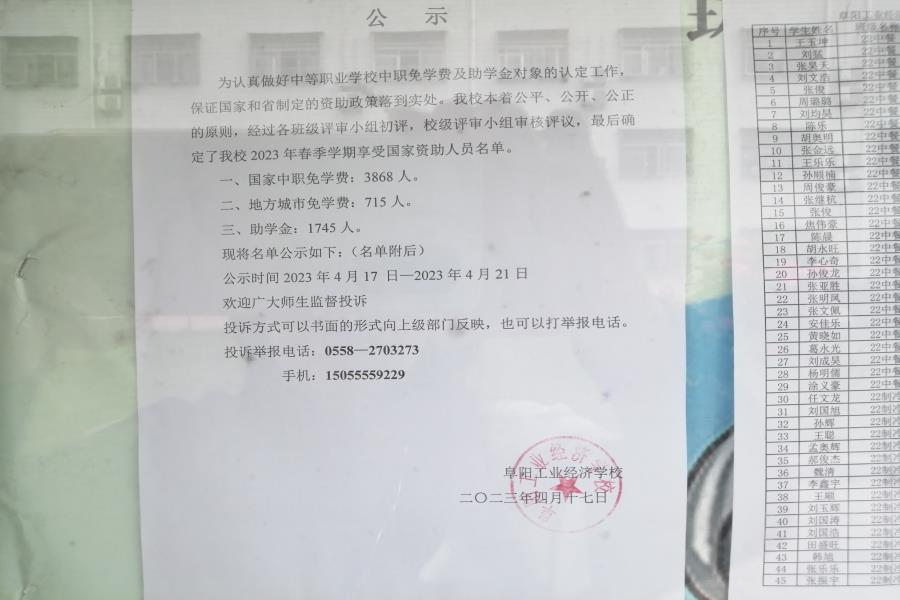 阜阳工业经济学校 2023年春季学期资助、免学费公示