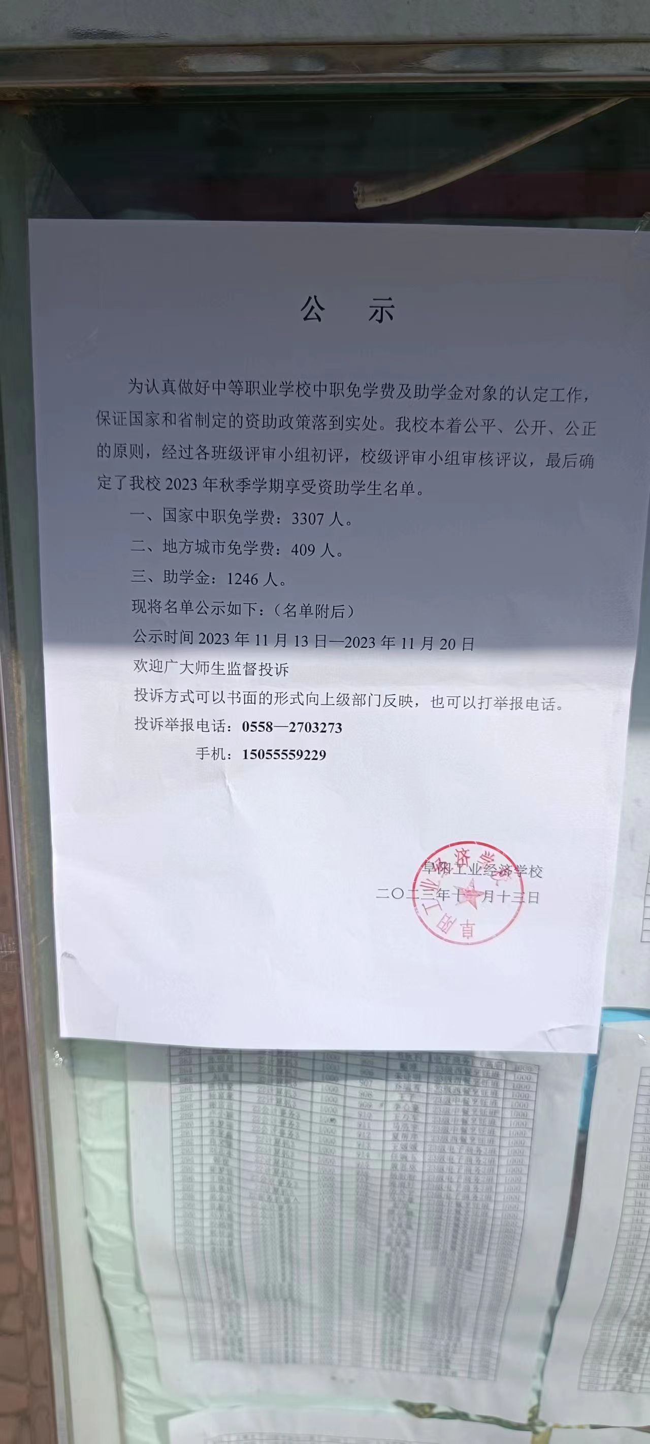 阜阳工业经济学校 2023年秋季学期资助、免学费公示