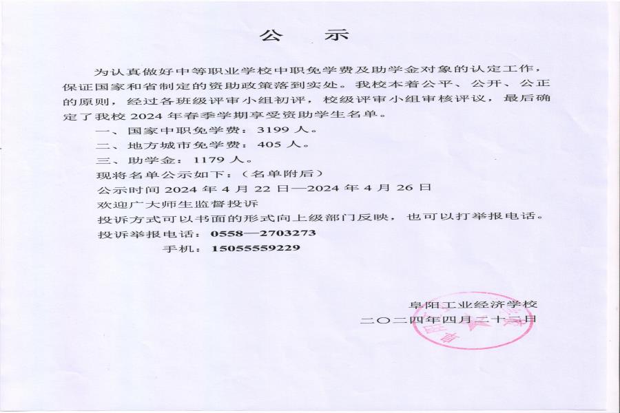 阜阳工业经济学校 2024年春季学期资助、免学费公示
