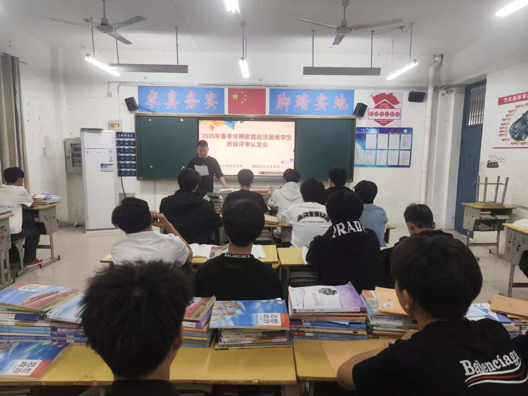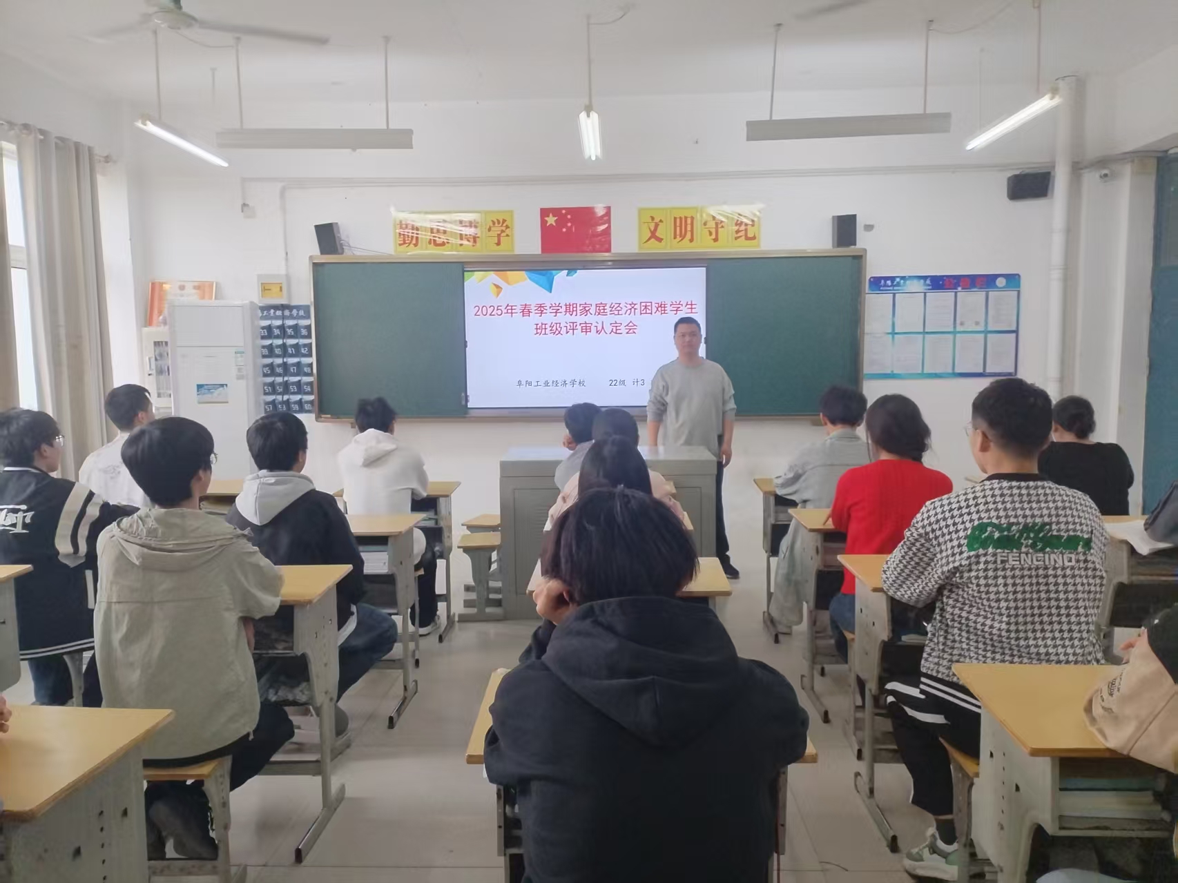 阜阳工业经济学校2025年春季学期根据皖财教[2024]1252号文件、阜财教[2025]42号文件通知要求正式启动家庭经济困难学生班级评审认定工作。各班级按照校资助办公室工作要求利用晚自习时间召开国家助学金家庭经济困难学生评审认定会,班主任系统地讲解了国家助学金的认定办法、申请条件、标准、评审、申报流程及相关表格填写注意事项。